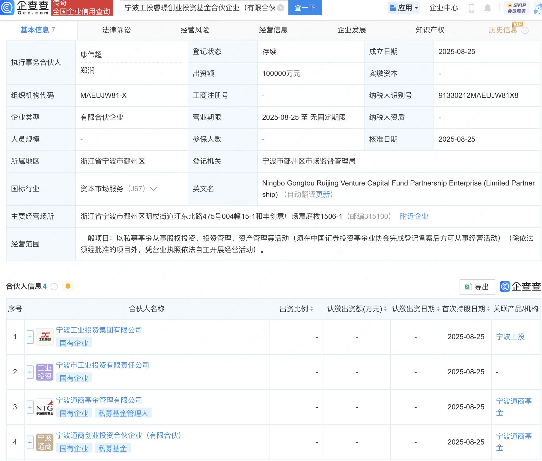近日,宁波工投睿璟创业投资基金合伙企业(有限合伙)成立,出资额10亿元,经营范围包含:以私募基金从事股权投资、投资管理、资产管理等活动。企查查股权穿透显示,该企业由宁波工业投资集团有限公司等共同出资。