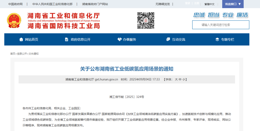9月4日,湖南省工业和信息化厅官网发布关于公布湖南省工业低碳氢应用场景的通知。