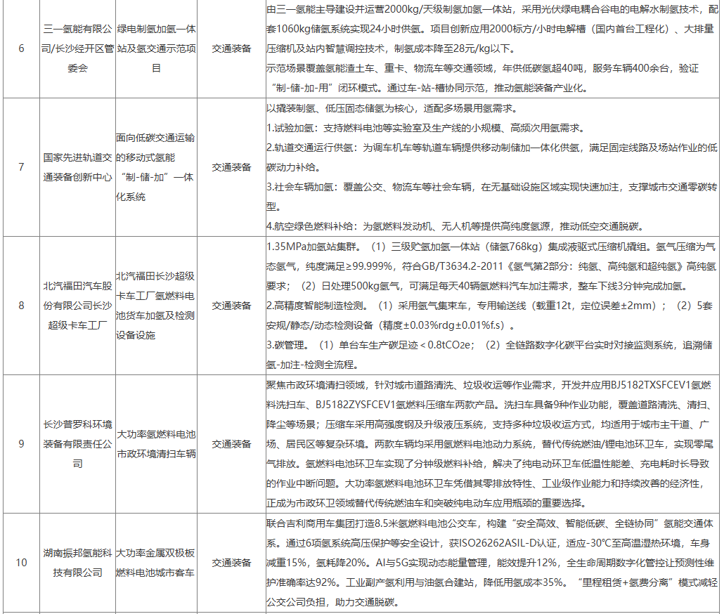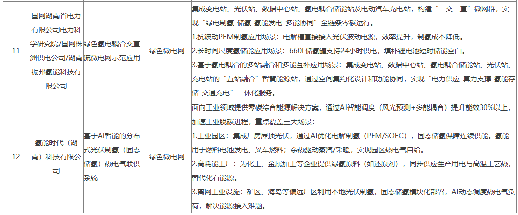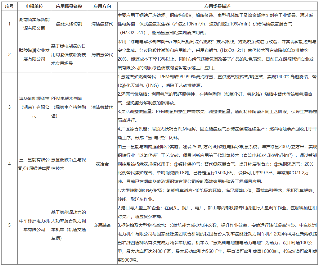 工业低碳氢应用场景名单中共包括申报的12个项目,诸如淳华氢能源科技(湖南)有限公司的PEM电解水制氢(绿氢生产特种陶瓷)、三一氢能有限公司/涟源钢铁集团的氢基低碳冶金与保护技术、中车株洲电力机车有限公司的基于氢能源动力的大功率混合动力调车机车(轨道交通车辆)等。