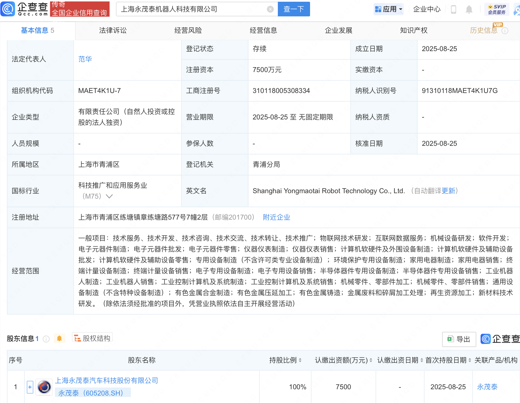近日,上海永茂泰机器人科技有限公司、上海永茂泰传感技术有限公司成立,注册资本同为7500万元,经营范围均包含:半导体器件专用设备制造;半导体器件专用设备销售;工业机器人制造;工业机器人销售等。企查查股权穿透显示,二者皆由永茂泰(605208)全资持股。